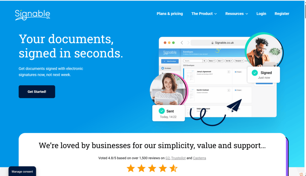Signable 是一家英国/欧洲的电子签名服务提供商,面向中小型企业和个人用户,提供简化合同与文档签署流程的线上解决方案。其平台支持即时发送电子合同/协议、设置自动提醒、防止文档存放失误等操作,帮助用户加快签署流程并提升合同文档管理效率。