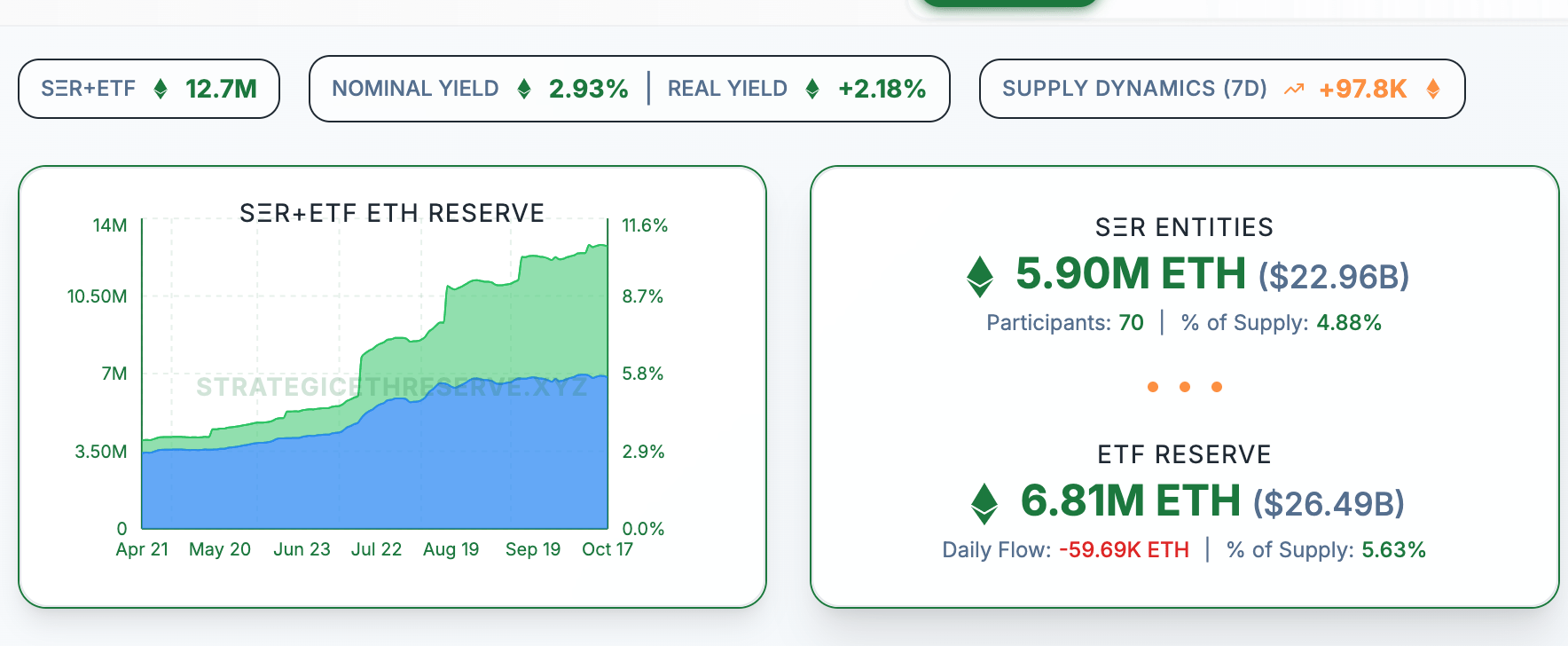 根据网站数据,目前共有 70 家公司在资产负债表中持有以太坊,总计 590 万枚 ETH(约合 222.96 亿美元),占以太坊总供应量的近 5%。这其中包括 Tom Lee 的 BitMine 和 Joseph Lubin 的 SharpLink Gaming 两家公司,它们已经将以太坊作为其主要储备资产。