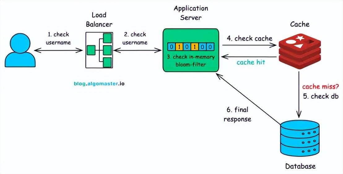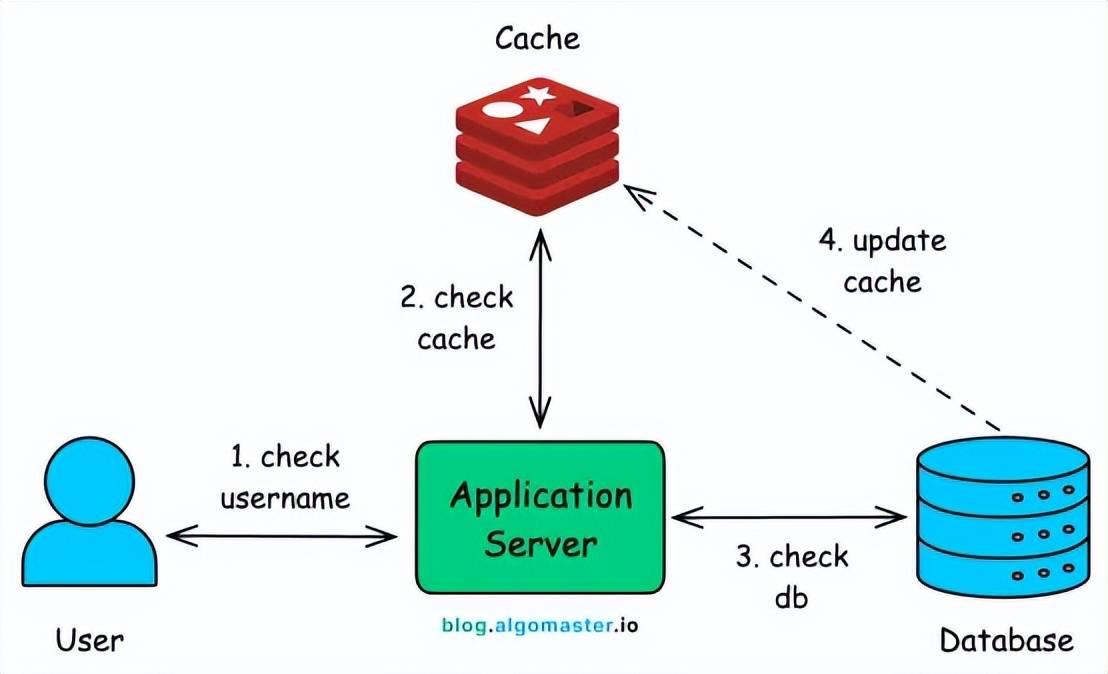 4)更新缓存(未来优化):一旦数据库返回答案,系统就会更新缓存,以便下次有人检查相同的用户名时,可以立即从内存中获取该用户名。