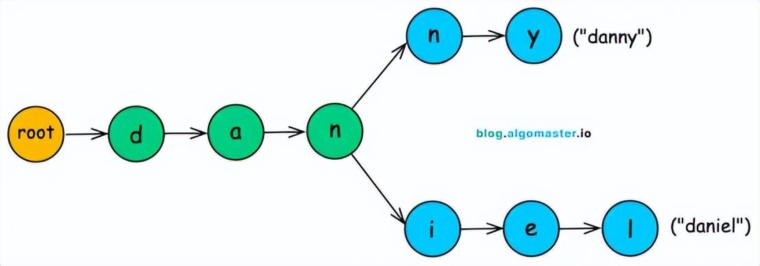 通过跟踪部分路径,trie可以立即列出所有以给定前缀开头的用户名(例如,“dan”)。